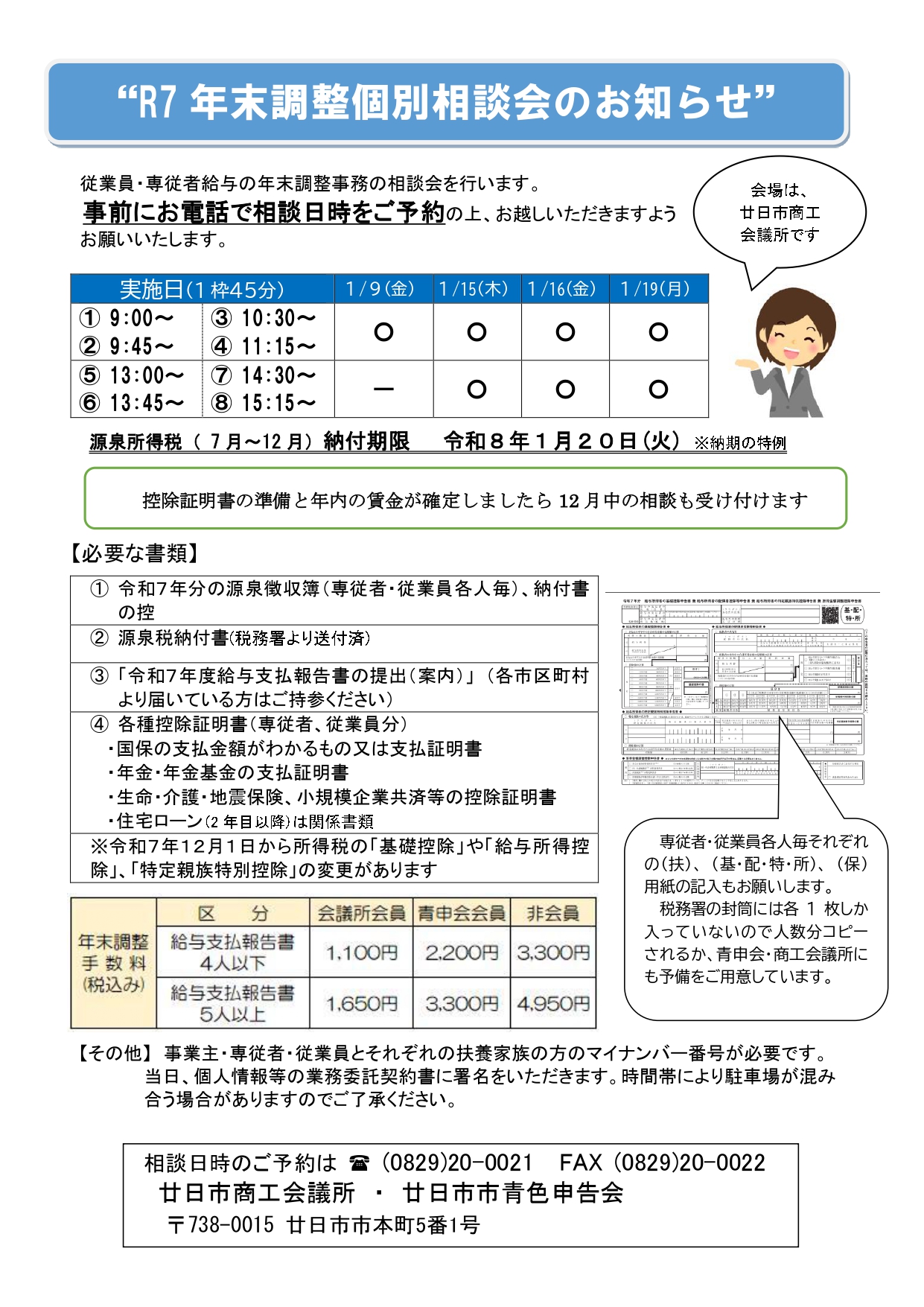 専従者並びに従業員に給料を支給している事業所の方は、源泉徴収並びに年末調整事務が必要です。商工会議所では、納期の特例を受けている会員様を対象に、毎年7月上旬に源泉徴収相談会、1月上旬に年末調整相談会を行っています。(混雑を避けるため事前申込が必要です。お電話ください。)