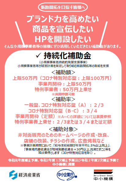 そんなとき、小規模事業者のみなさまに活用していただきたい補助金 ー小規模事業者持続化補助金ー があります!