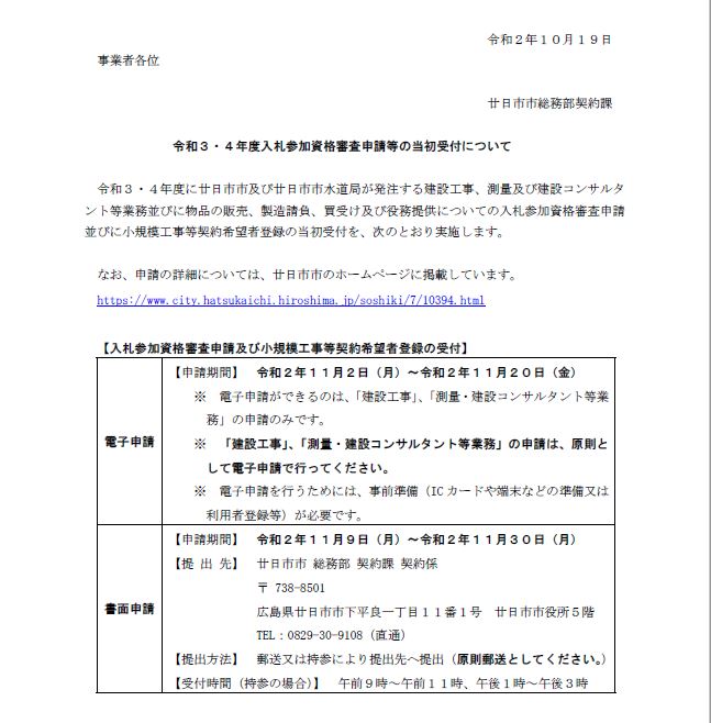 【建設業の方へ】廿日市市入札参加申請等について案内 2020 10/21 お知らせ 2020年10月21日 令和3・4年度入札参加資格審査申請等の受付が開始されます。 詳しくはPDFをご確認ください。 お知らせ コロナ関連の支援策情報は「今こそ廿日市」特設サイトをご覧ください。 廿日市オリジナル カープコラボTシャツ完成!(11月9日更新)