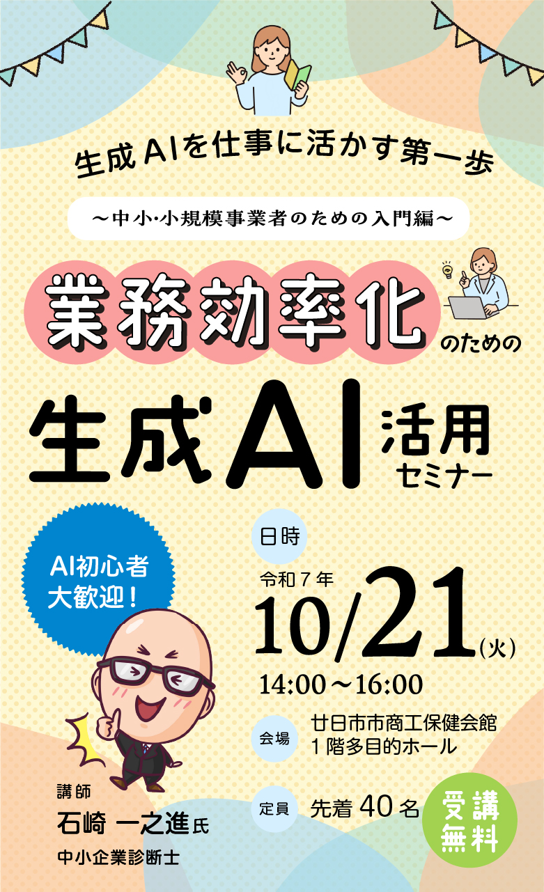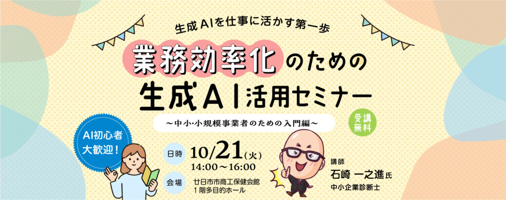 | タイトル | ~中小・小規模事業者のための入門編~ 生成AI入門セミナー |
