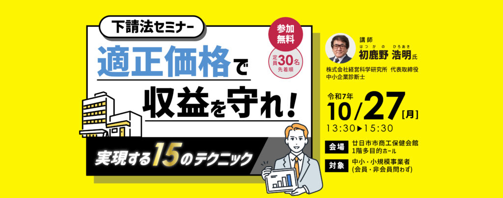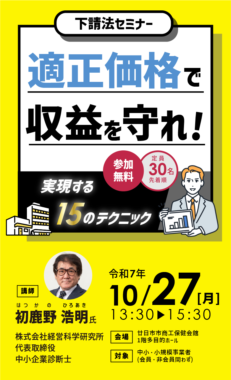 | セミナー概要 | 下請法改正の概要と、価格改定・価格調整の基礎を学び、今行える効果的な対策方法を分かりやすく解説致します。 |